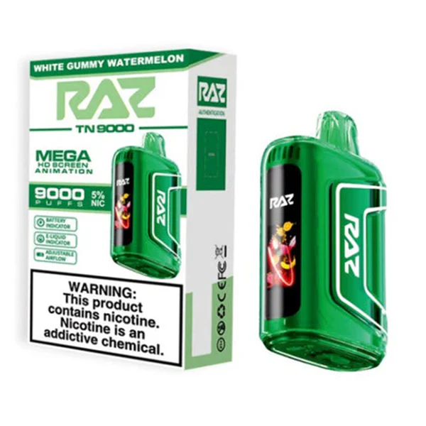 Raz 9000 Vape-Aromen Weiße Gummi-Wassermelone bringt eine verspielte Variante von leckerer frischer Wassermelone mit der Süße weißer Gummibonbons! Dieses wunderlich fruchtige Vape fängt die Essenz vergangener Sommertage und -nächte ein.